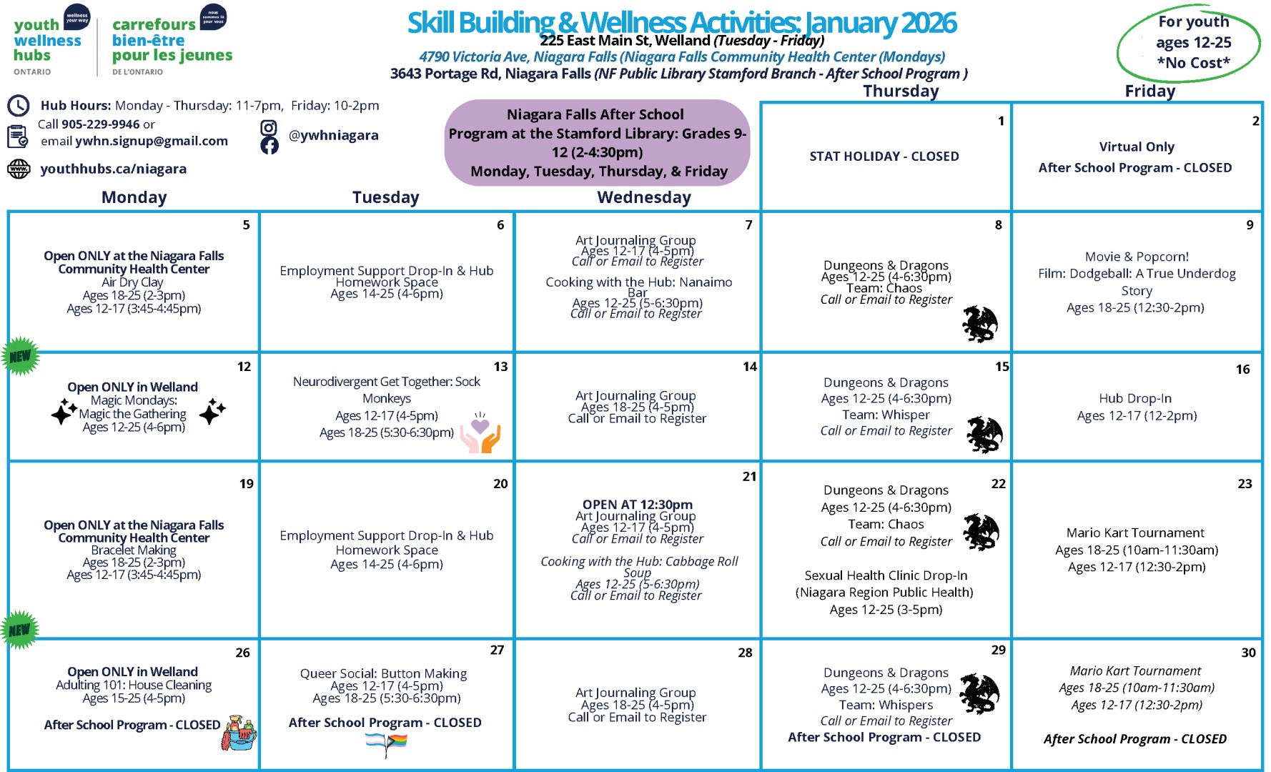 The YWHO Niagara Region provides the following supports free of charge for youth aged 12-25.